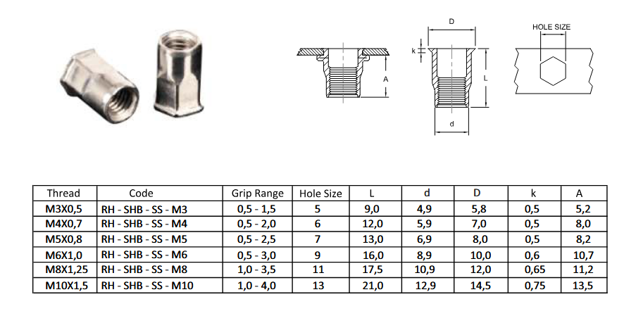 Nerezové nýtovací matice semi-hexagonální s redukovanou hlavou
